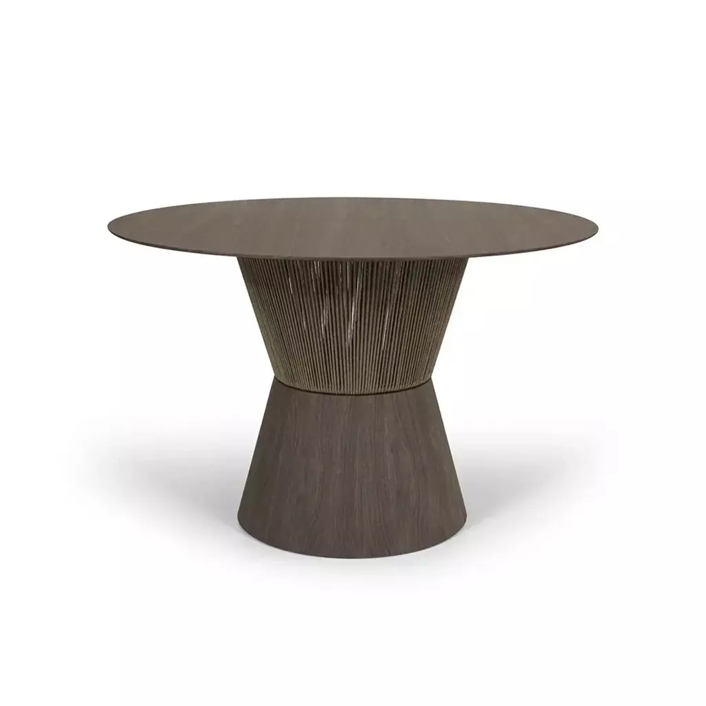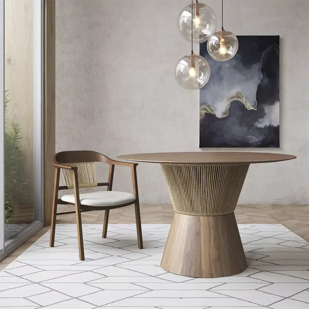 La estructura robusta de madera resalta la belleza natural del material, aportando calidez y durabilidad. Su forma redonda suaviza el ambiente y facilita la integración en diferentes estilos de decoración, desde lo moderno hasta lo clásico.